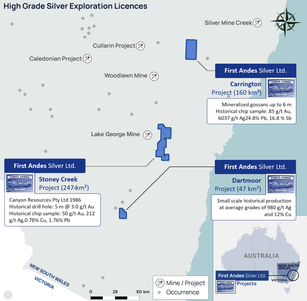 Vancouver, British Columbia – March 17, 2026 – FIRST ANDES SILVER LTD. (TSXV: FAS; OTC Markets: FASLF; FSE: 9TZ0) (“First Andes” or the “Company”) today announced the grant of three Exploration Licences (“EL”) comprising the Carrington Project (“Carrington”), the Stony Creek Project (“Stony Creek”) and the Dartmoor Project (“Dartmoor”) (together, the “Silver Projects”) in New South Wales, Australia. The Silver Projects collectively cover approximately 454 km² of highly prospective ground within the Lachlan Orogenic Belt, a region hosting numerous historic silver-gold mines and polymetallic mineral occurrences.