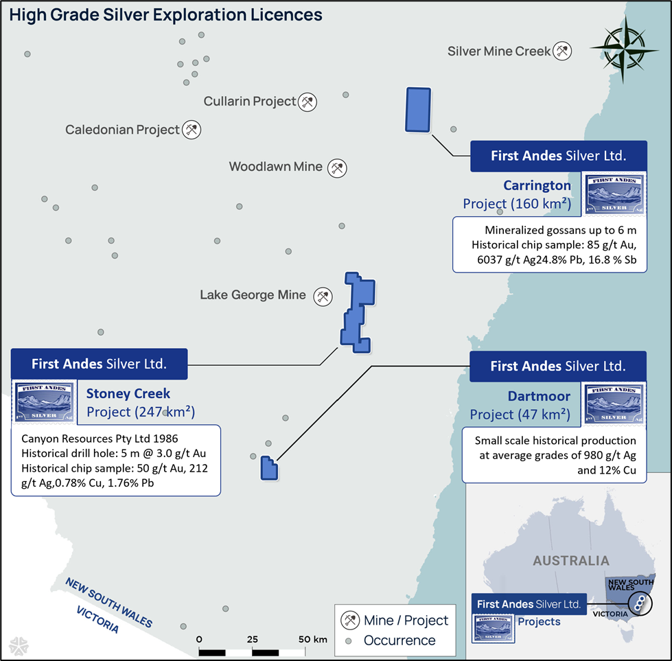 Vancouver, British Columbia – February 3, 2026 – First Andes Silver Ltd. (TSXV: FAS; OTC Markets: MSLVF; FSE: 9TZ0) (“First Andes” or the “Company”) today announced that it has completed its acquisition of three (3) silver-focused exploration projects known as the Carrington Project (“Carrington”), the Stony Creek Project (“Stony Creek”) and the Dartmoor Project (“Dartmoor”) (together, the “Silver Projects”), located in New South Wales, Australia (Figure 1).